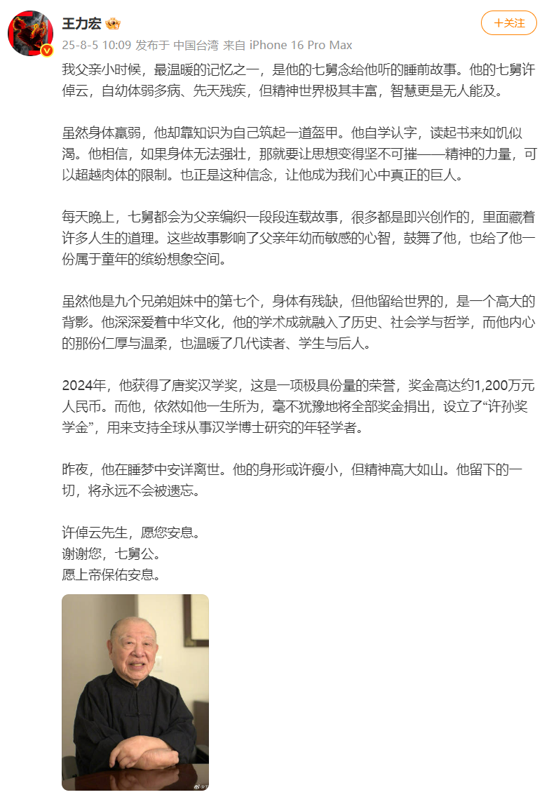 虽然他是九个兄弟姐妹中的第七个,身体有残缺,但他留给世界的,是一个高大的背影。他深深爱着中华文化,他的学术成就融入了历史、社会学与哲学,而他内心的那份仁厚与温柔,也温暖了几代读者、学生与后人。