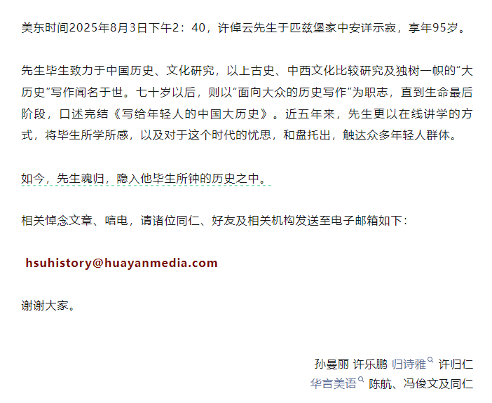 美东时间2025年8月3日下午2:40,许倬云先生于匹兹堡家中安详示寂,享年95岁。